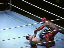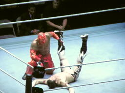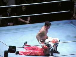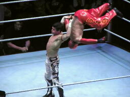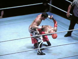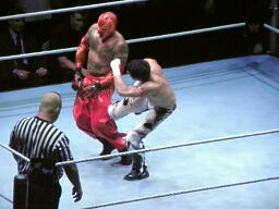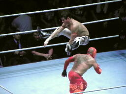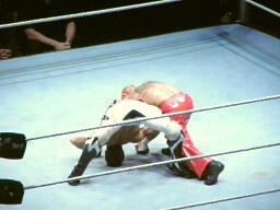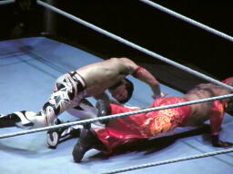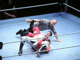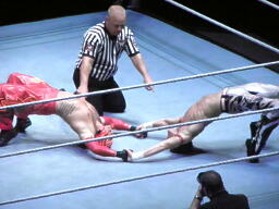 両者肩が着く、カウント2で両者ブリッジ(左写真)。