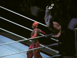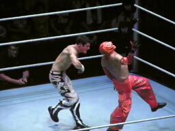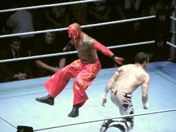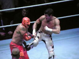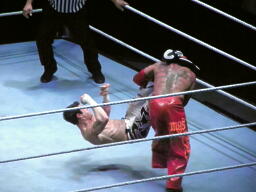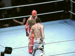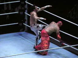 エヴァンショルダースルー、ミステリオ一回転して背後に着地(右写真)するとエヴァンの背中にドロップキック。ロープにもたれたエヴァンにミステリオ619、エヴァンかわして場外エスケープ。
