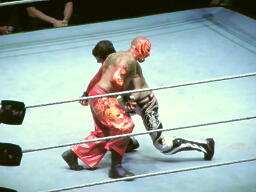 ロープにもたれたミステリオにさらにキック(左写真)。