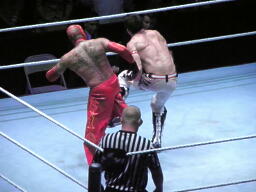 ミステリオもローキック返す(右写真)。