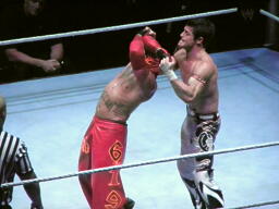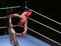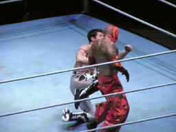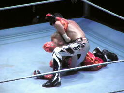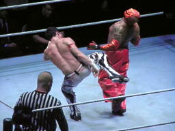 ロープワークからミステリオがカサドーラに行くがエヴァンはフェースバスターに切り返す(左写真)、カウント2。