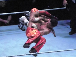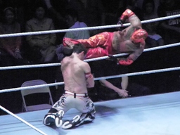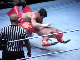 両者ロープに飛んでクロスボディ相打ち(右写真)。