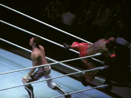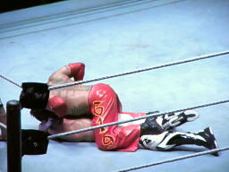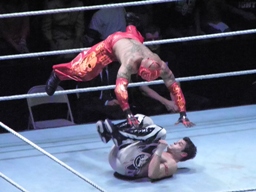エヴァンはエアボーン狙ってコーナーに上る、ミステリオ起き上がってパンチ(左写真)。