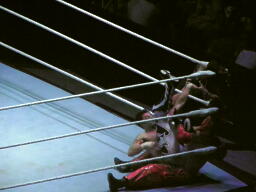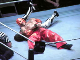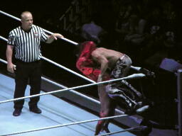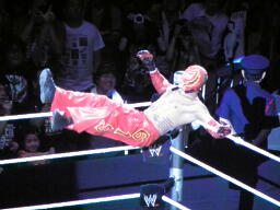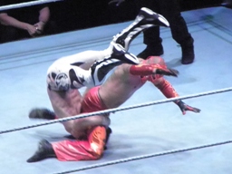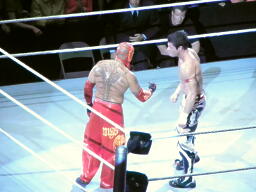 コーナーに寝っ転がるミステリオ(左写真)。素晴らしい。