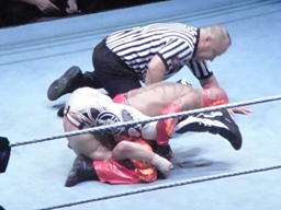 エヴァンロープに振る、ミステリオロープに飛び乗って反転クロスボディ(左写真)、カウント2。