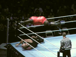 ヘンリーがロープに振るがビッグショーはフライングショルダーブロック(右写真)。