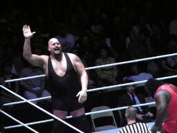 ビッグショーはチョークスラム予告(右写真)、