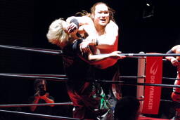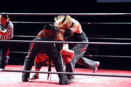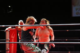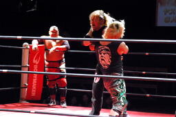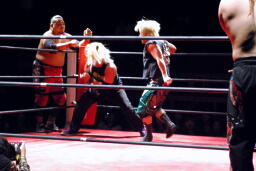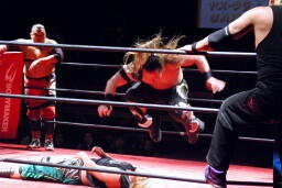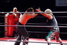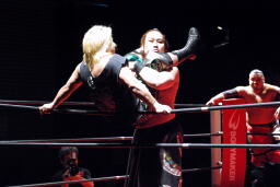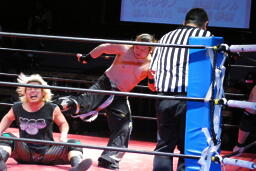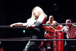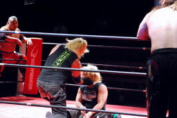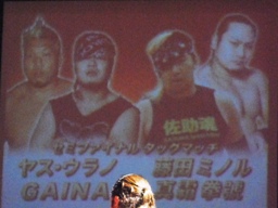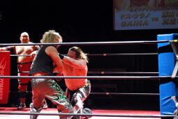 藤田ロープに飛ぶ、ウラノドロップキック。ウラノは耳元で大声(右写真)、GAINAにタッチ。