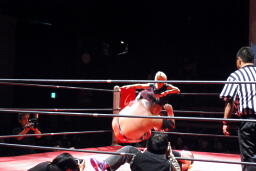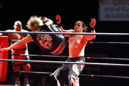 真霜首投げからサッカーボールキック(右写真)、カウント2。