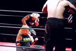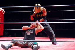 真霜ストンピング、ウラノは真霜のボディにパンチ(右写真)。