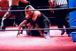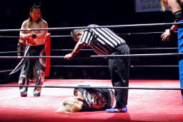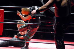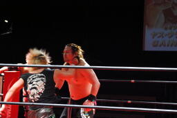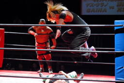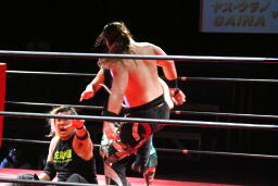 ボディスラムからエルボードロップ(右写真)、カバーは真霜がカット。藤田「どっかの王様だろこいつ!」GAINAはウラノにタッチ。