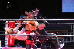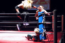 真霜ロープに振る、ウラノ切り返してドロップキック(左写真)、GAINAにタッチ。