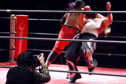 手四つでリスタート(右写真)、真霜は自軍コーナーに押し込んで藤田にタッチ。