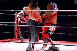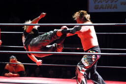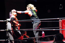 ウラノも上って雪崩式フランケンシュタイナー(左写真)、ロープに飛んでドロップキック、カウント2。20分経過。