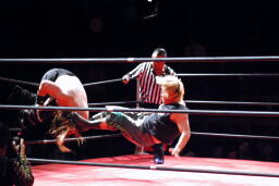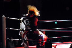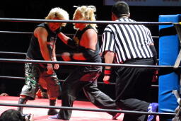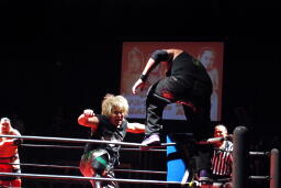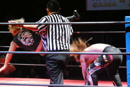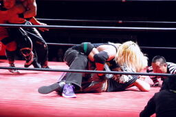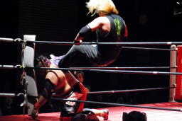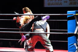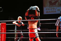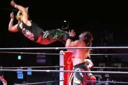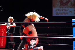 藤田ロープに飛ぶ、GAINAキャッチしてマンハッタンドロップ(右写真)。