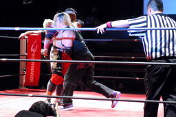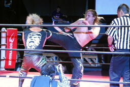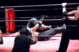 真霜ロープに飛ぶ、ウラノはレフェリーを引っ張り込んで真霜を止め、延髄蹴り(左写真)。