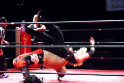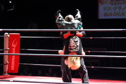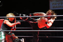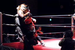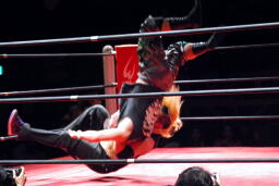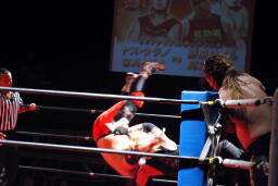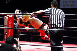GAINAコーナーに上る、藤田は雪崩式ブレーンバスターに(右写真)。両軍タッチ。