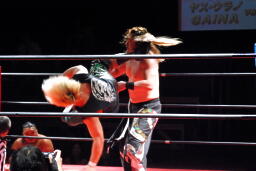 真霜とGAINAチョップ打ち合い(右写真)、真霜は藤田にタッチ。