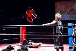 トップロープに引っ掛けてドロップキック(右写真)、カウント2。