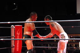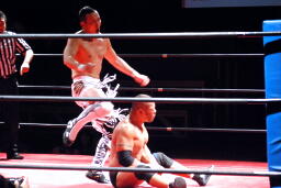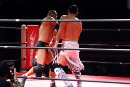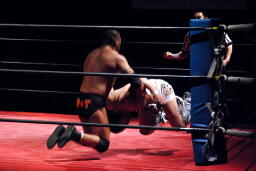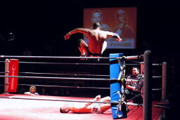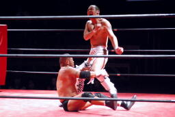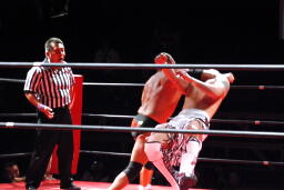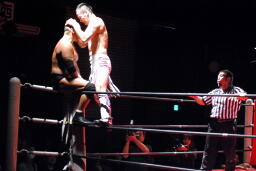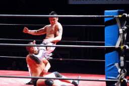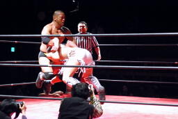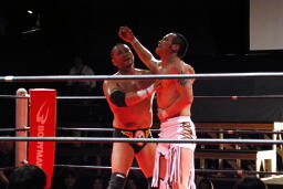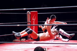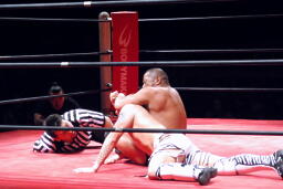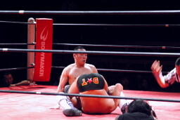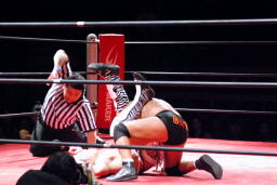 東郷もう一発ラリアット、HIROKIかわして逆さ押さえ込み、東郷これを切り返してぺディグリー(左写真)、カウント2。
