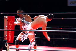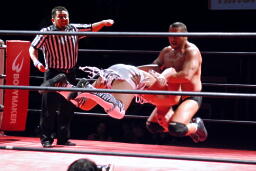 HIROKIロープに飛ぶ、東郷カウンターのラリアット(右写真)、カウント2。