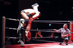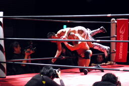 東郷ロープに飛ぶ、HIROKIキャッチして再度スリーパーに、東郷がHIROKIを振り落として場外に出す(左写真)。