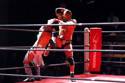 コーナーに上ってダイビングセントーン(左写真)、カウント3。