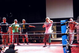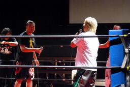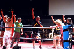 ウラノ「今日出てくれた先輩たちも良かったらリングに上がってください。。」GENTARO、YOSHIYA、MIYAWAKIがリングに(左写真)。