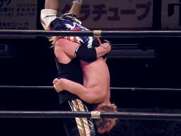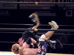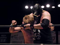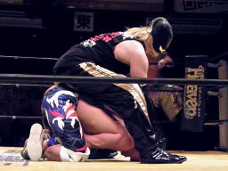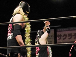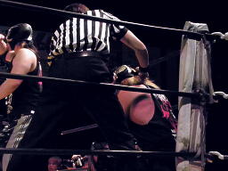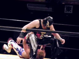日高がドラゴンスリーパーの体勢、コーナーから谷嵜がフットスタンプ落とし(左写真)日高ファイナルカット、カウント2。日高がロープ際のXXに突っ込む、XX場外に落としてトペ。