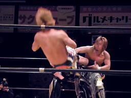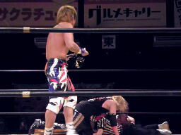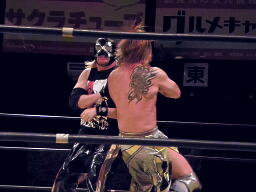 日高にサンドイッチジャンピングハイキック(左写真)、ダブルのブレーンバスター、Xがカバー、カウント2。15分経過。