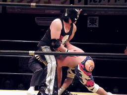 XXキャッチしてケブラドーラ・トド・アルト(左写真)、マットに叩きつける。そこにXがダイビングボディプレス、谷嵜がカット。