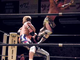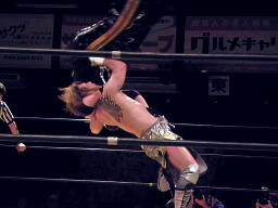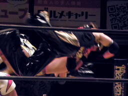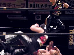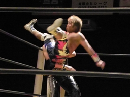 谷嵜XXにパンチ、Xにはドロップキック。コーナーに上ってダイブ、Xが下からドロップキックで撃墜(右写真)。