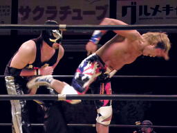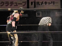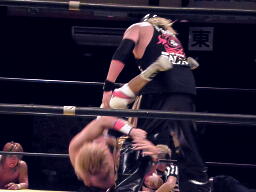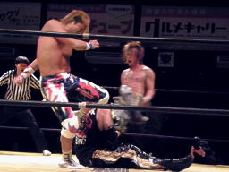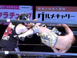 XXコーナーに振って串刺しラリアット、そして風車式ストマックブロック、カウント2。XXロープに飛ぶ、谷嵜カウンターのジャンピングハイキック(左写真)、日高にタッチ。