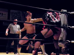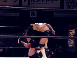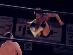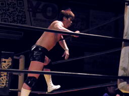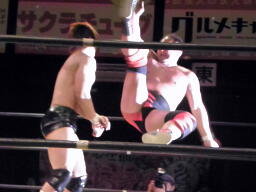 大谷ロープに飛ぶ、小幡カウンターのジャンピングハイキック。小幡コーナーに上ってミサイルキック(左写真)2発、カウント2。