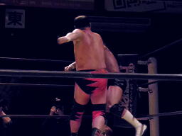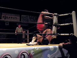 小幡ドロップキックで先制、大谷を場外に落とし(右写真)プランチャに。場外でヒザ蹴り、鉄柱攻撃、客席に投げ込む。イスに座らせてドロップキック。