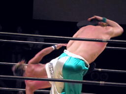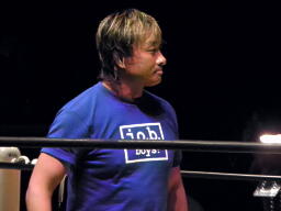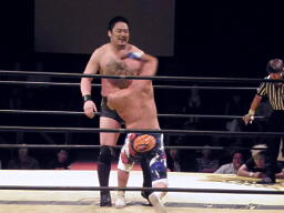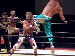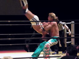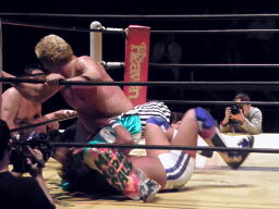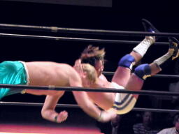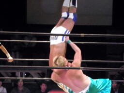 KAMIKAZEヒザ砕きから逆片エビの体勢、日高ブロック(右写真)。KAMIKAZEは腕を取って絞る。KAMIKAZEアキレス腱固めに、日高ロープ。KAMIKAZEは佐藤にタッチ。日高ローキック、ロープに飛ぶ、佐藤カウンターのキチンシンク。パイルドライバーからカバー、FUNAKIカット。KAMIKAZEにタッチ。
