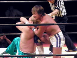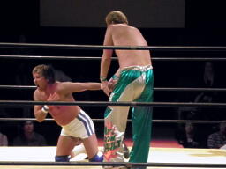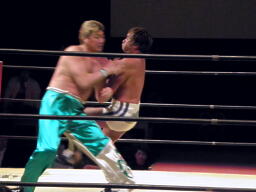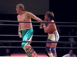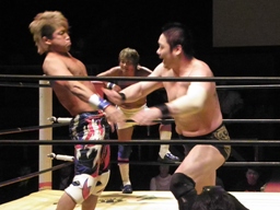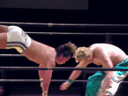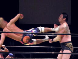 佐藤キック、チョップ打ち合い(左写真)、佐藤ローキック。佐藤ボディスラムからストンピング。KAMIKAZEにタッチ。10分経過。