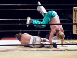 KAMIKAZE両足取って逆エビに、FUNAKIブロックして両足でホイップ、KAMIKAZE側転で着地(左写真)。