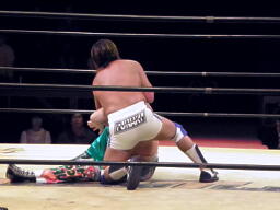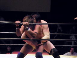 FUNAKI回転エビ固め、KAMIKAZEロープをつかんでブロック(左写真)、レフェリーがロープを蹴ると回転エビ固め完成、しかしカウントは2。