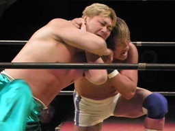 再度ロックアップ、KAMIKAZEヘッドロック、FUNAKIロープに振る、KAMIKAZEショルダーブロック(右写真)。