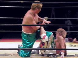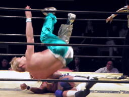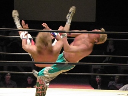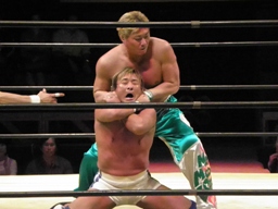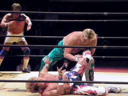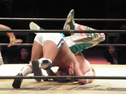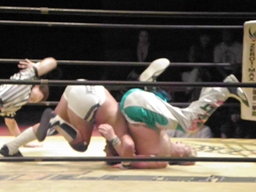 KAMIKAZEロープに振る、FUNAKIブロックして逆さ押さえ込み(右写真)、カウント3。