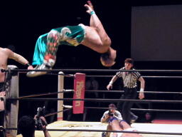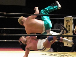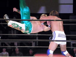 日高ドロップキック(右写真)、佐藤倒れず。佐藤ロープに振ってラリアット、日高かわして低空ドロップキック。
