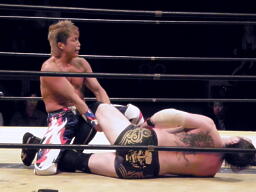エルボー落としてレッグロック、佐藤ロープ。日高トーホールド(左写真)、キックでブレーク。KAMIKAZEにタッチ。