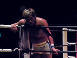 日高がタッグタイトル挑戦をぶちあげている間コーナーで休憩(右写真)。