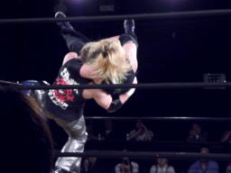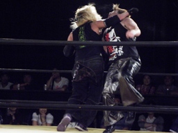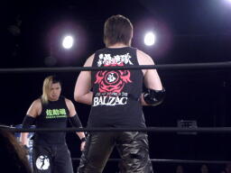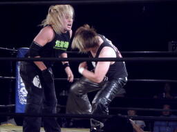 菅原は藤田をコーナーに上げて雪崩式の十三不塔狙う、藤田ブロック、体勢入れ替えて雪崩式フランケン(左写真)、ダブルノックダウン。