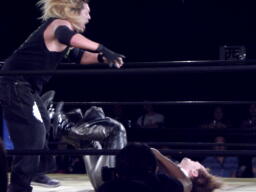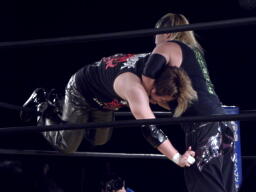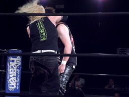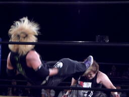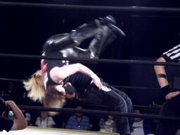 場外戦。藤田ストンピング、パンチ(左写真)。藤田リングに戻る。菅原がエプロンに立つと藤田はドロップキック、トペ・スイシーダ。イス攻撃、リングに戻す。