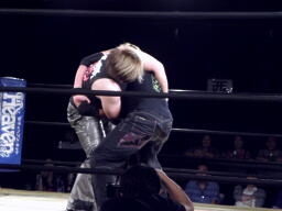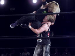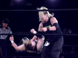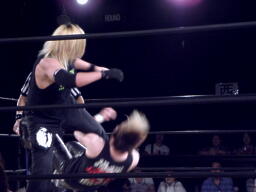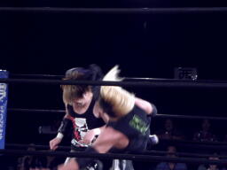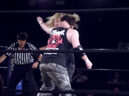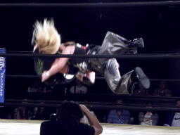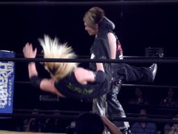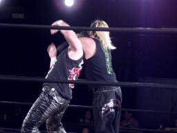 菅原足にキック、ロープに飛ぶ、藤田キャッチしてマンハッタンドロップ(右写真)。