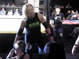 藤田ストンピング、首投げから後頭部にドロップキック(左写真)。