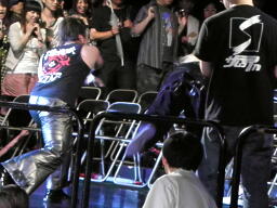 菅原ブロックして藤田を客席に放り込む(右写真)。菅原は藤田の足にイス攻撃、リングに戻す。