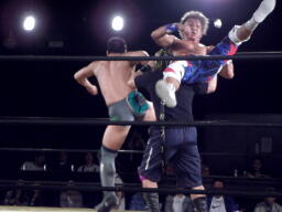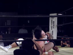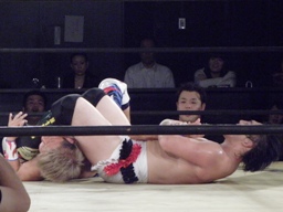 日高エルボー連打、佐藤キャッチして飛びつき十字固め(左写真)、日高ロープ。